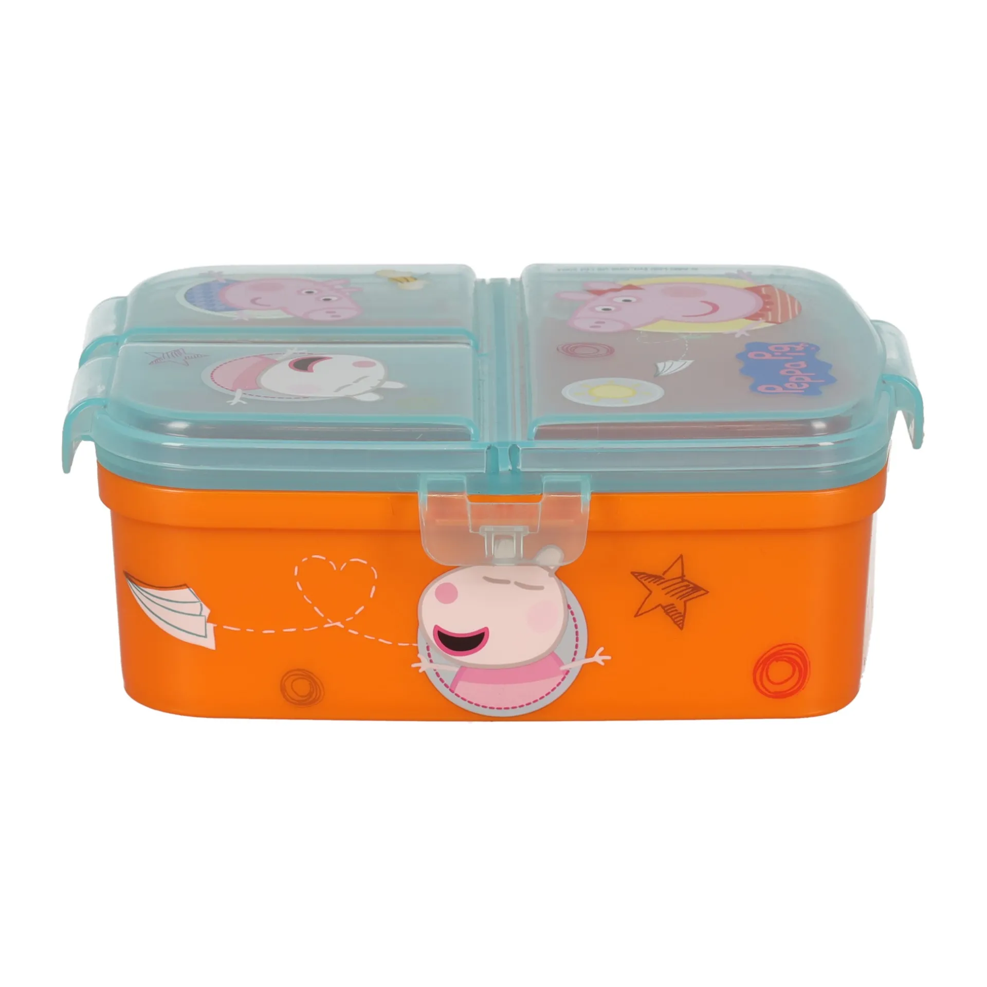 Peppa Pig doos met veel vakken. De Peppa Pig lunchbox heeft een zeer groot vak voor een broodje en 3 kleine vakken voor fruit, koekjes of ander lekkers. Perfect voor het bewaren van je favoriete lunch.