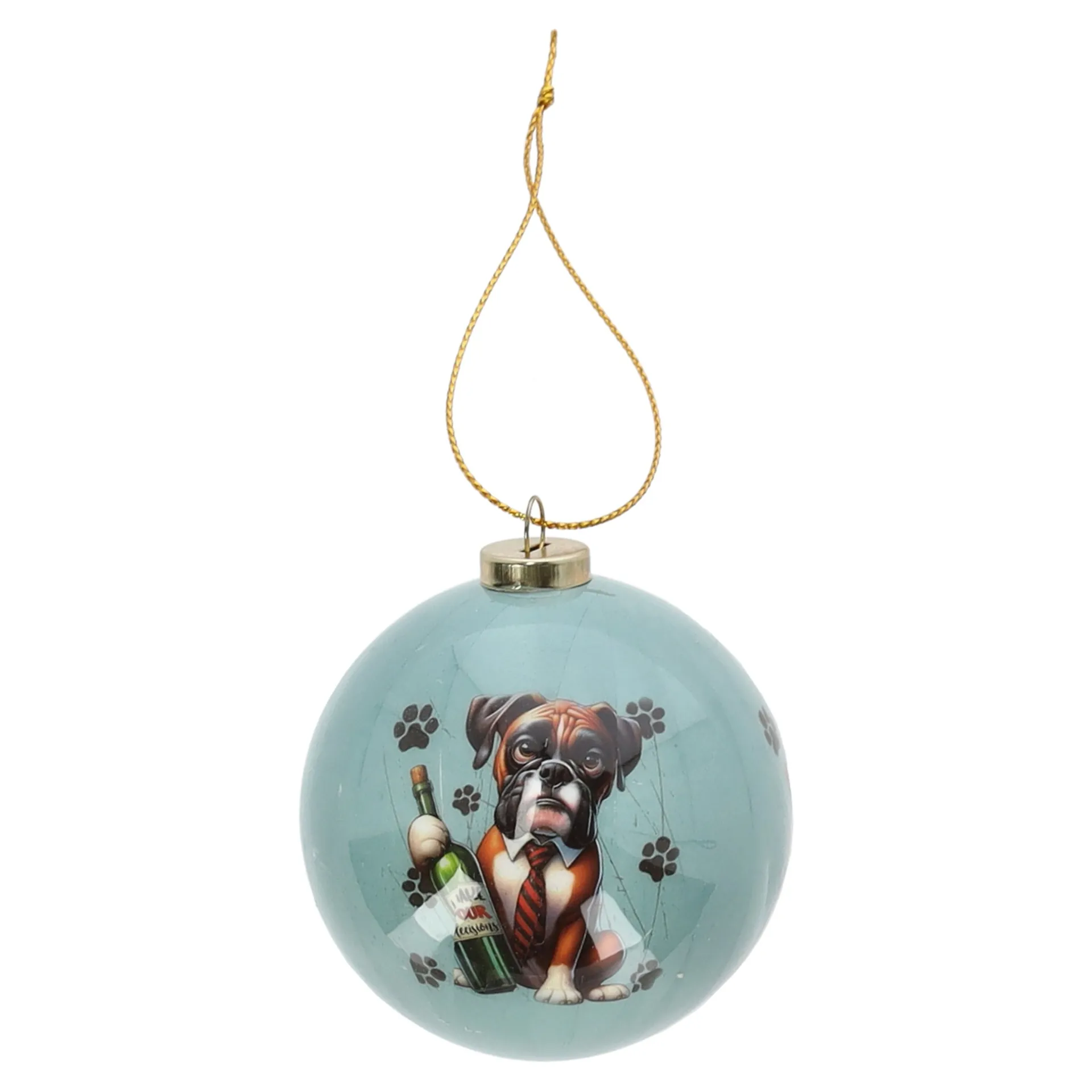 Een leuke kerstbal voor hondenliefhebbers! Deze lichtblauwe kerstbal is bedrukt met een grappige boxer met een fles wijn en pootafdrukken rondom. De bal is afgewerkt met een goudkleurig ophangkoord en heeft een glanzende afwerking. Gemaakt van kunststof, licht van gewicht en eenvoudig op te hangen.
