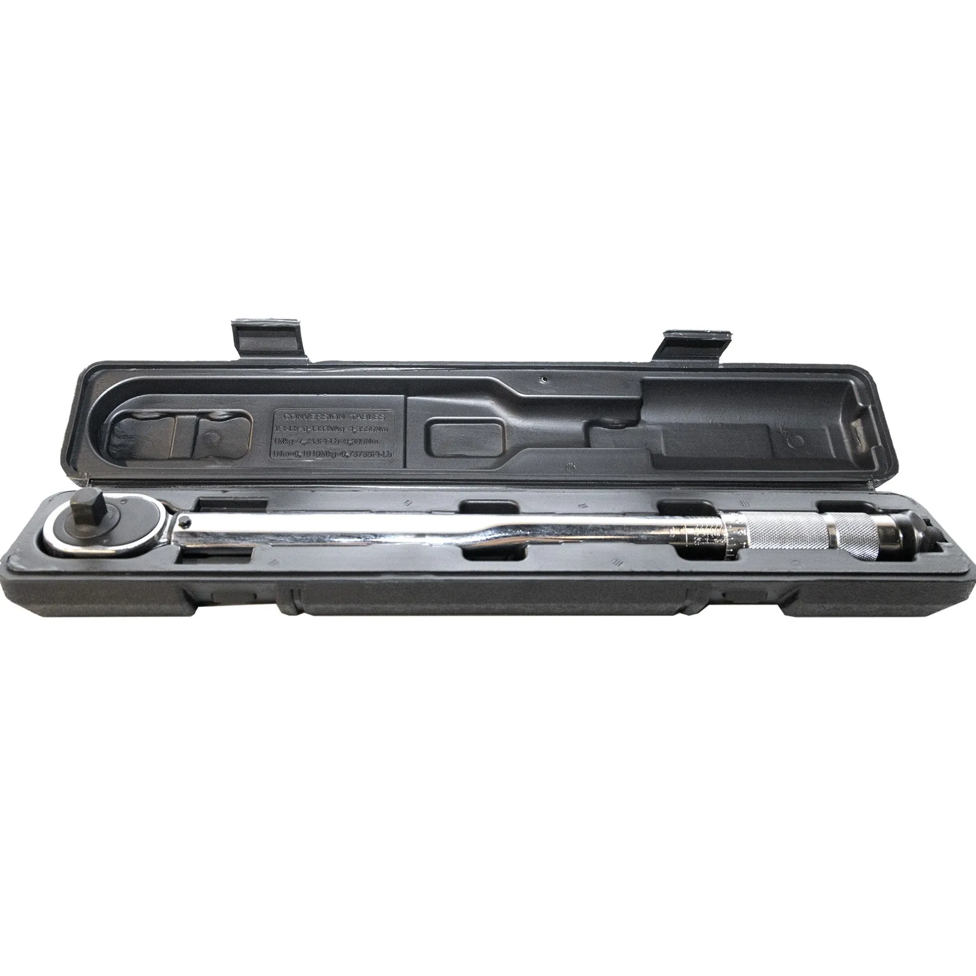 Een variabele momentsleutel (28–210 Nm, 1/2″ dopaansluiting) met links- en rechtsdraaiend mechanisme. Wordt geleverd met opbergkoffer, ideaal voor auto- en fietswerk.