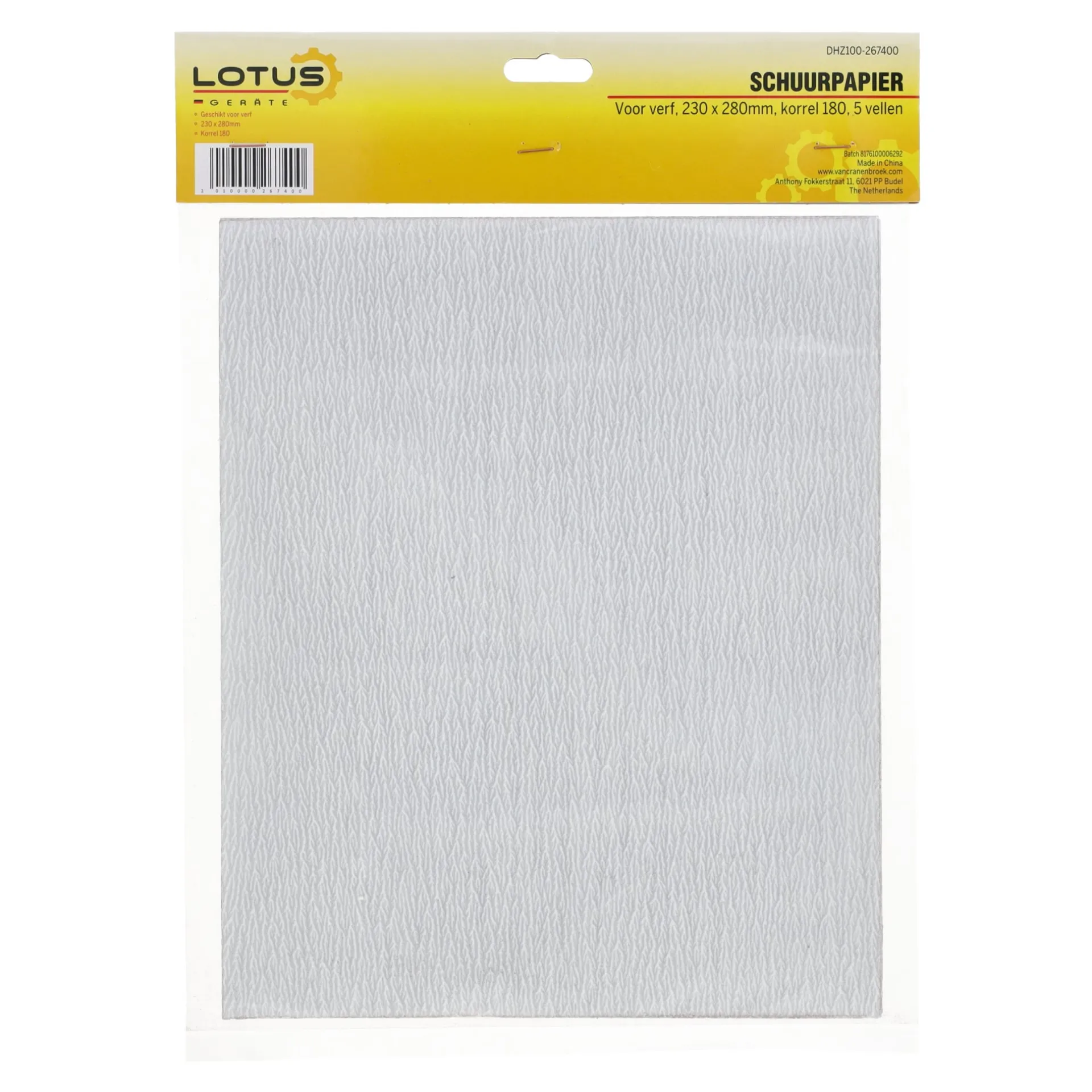 Schuurpapier voor verf in vellen van 230 x 280 mm met korrel 180, geschikt voor fijn schuurwerk en het glad afwerken van geschilderde oppervlakken.