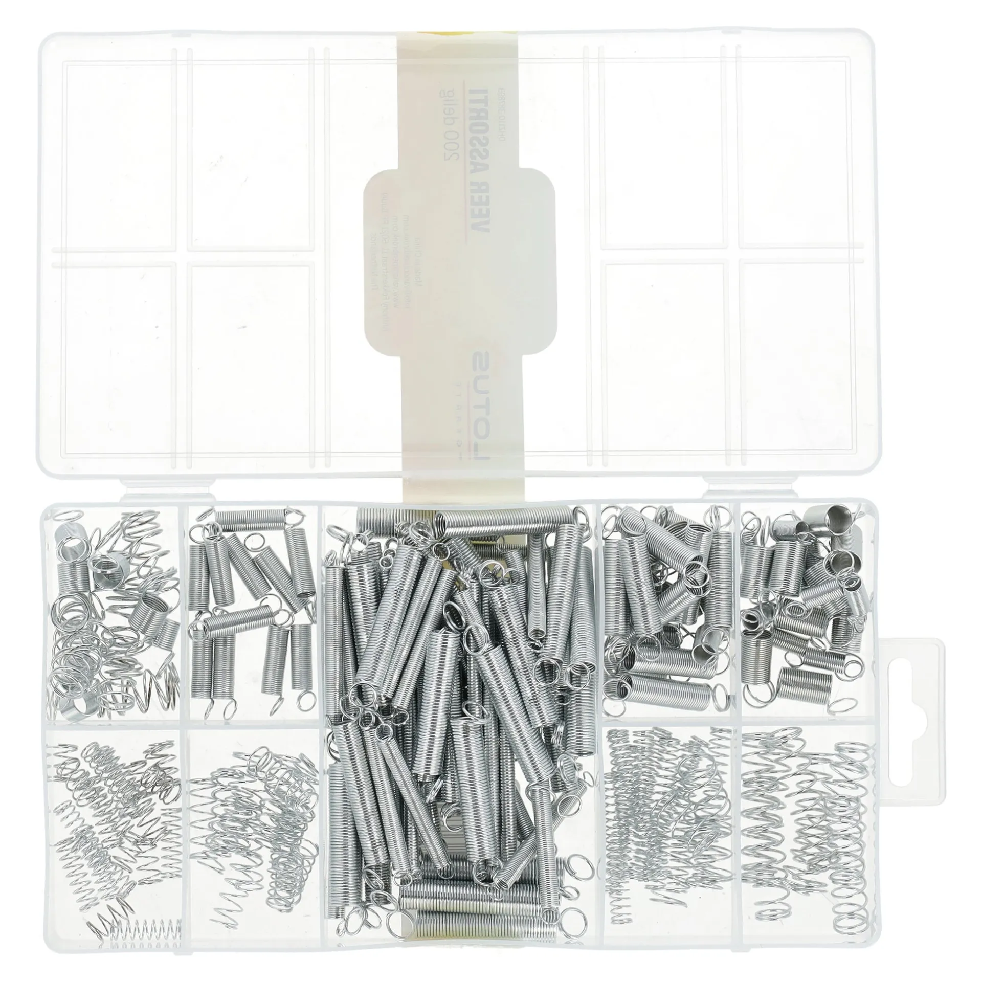 200-delige set met veren in verschillende maten, netjes gesorteerd in een transparante opbergdoos van Lotus.