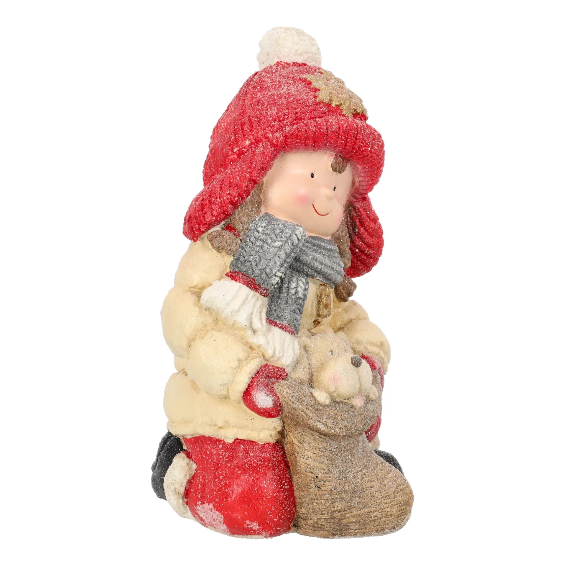 Decoratief beeld van een kind met een hond in een sok met sneeuwachtig effect en warme winterkleuren. Perfect als sfeervolle kerst- of winterdecoratie.