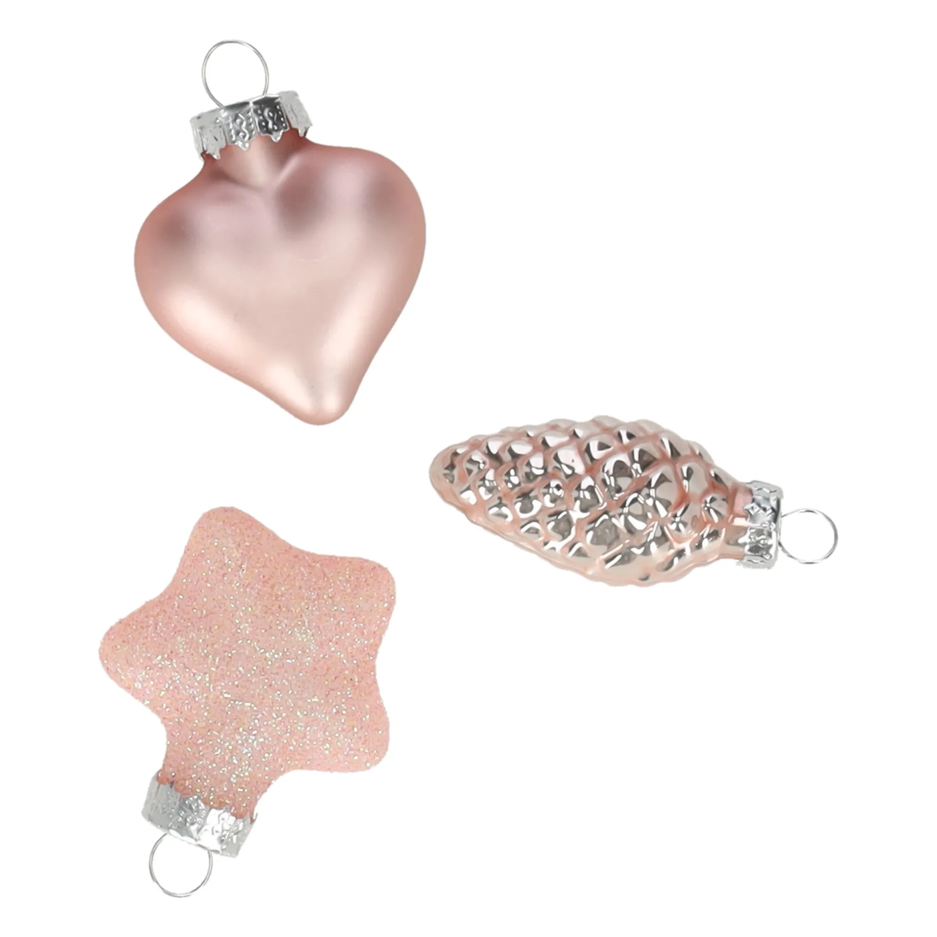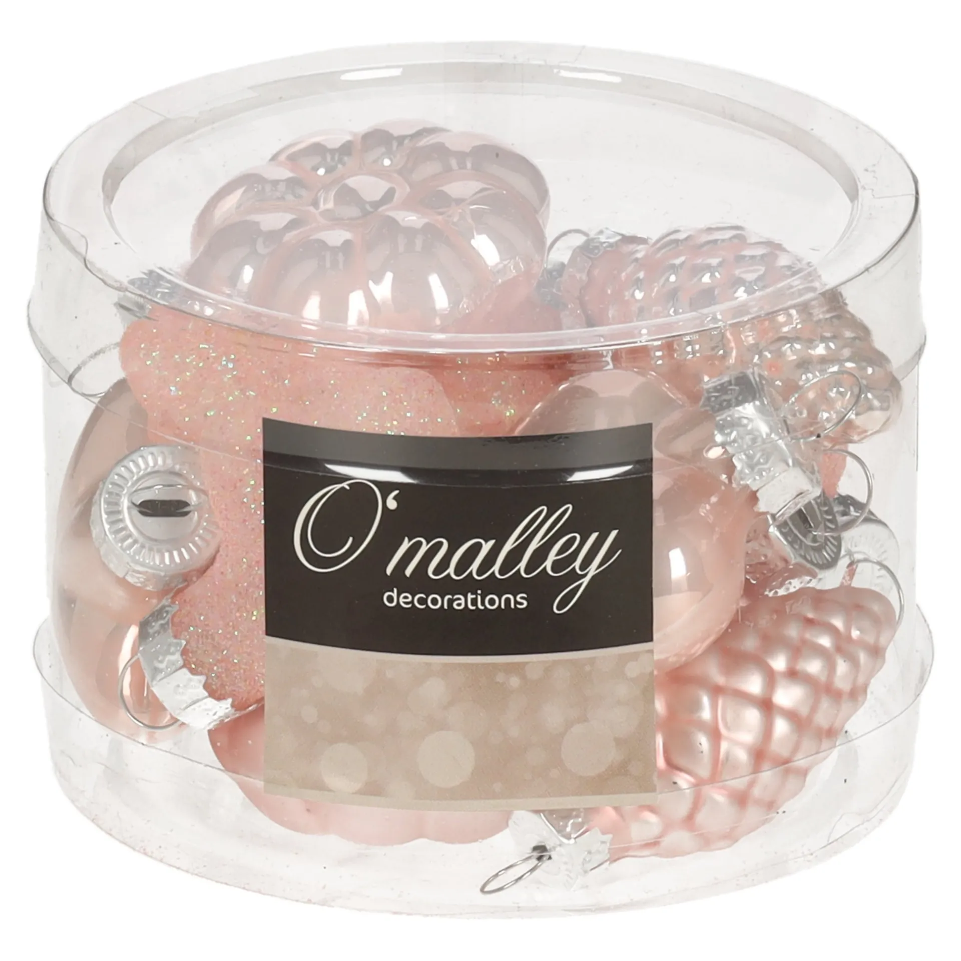 Set van 12 roze kersthangers in een transparante koker, bestaande uit verschillende vormen met matte, glanzende en glitteraccenten.