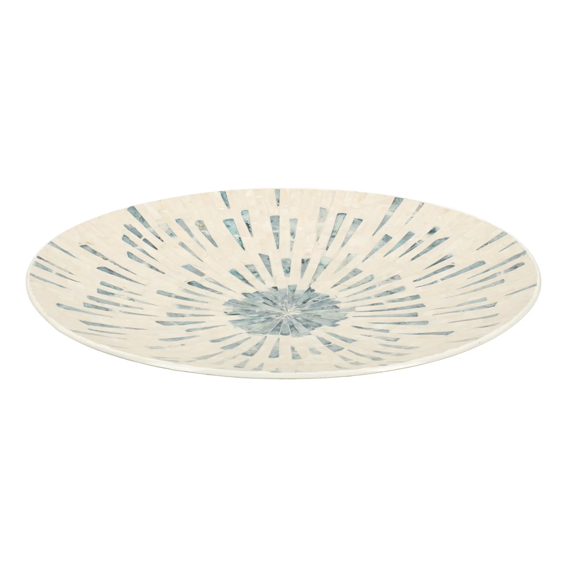 Deze stijlvolle schaal is gemaakt van capiz en heeft een prachtig mozaïekpatroon in witte en blauwgroene tinten. Het glanzende oppervlak zorgt voor een luxe uitstraling die mooi past in elk interieur. Met zijn diameter van 50 cm is de schaal ideaal als decoratief pronkstuk op tafel, dressoir of salontafel. Ook zonder inhoud trekt hij de aandacht door zijn unieke lichteffect en natuurlijke glans.