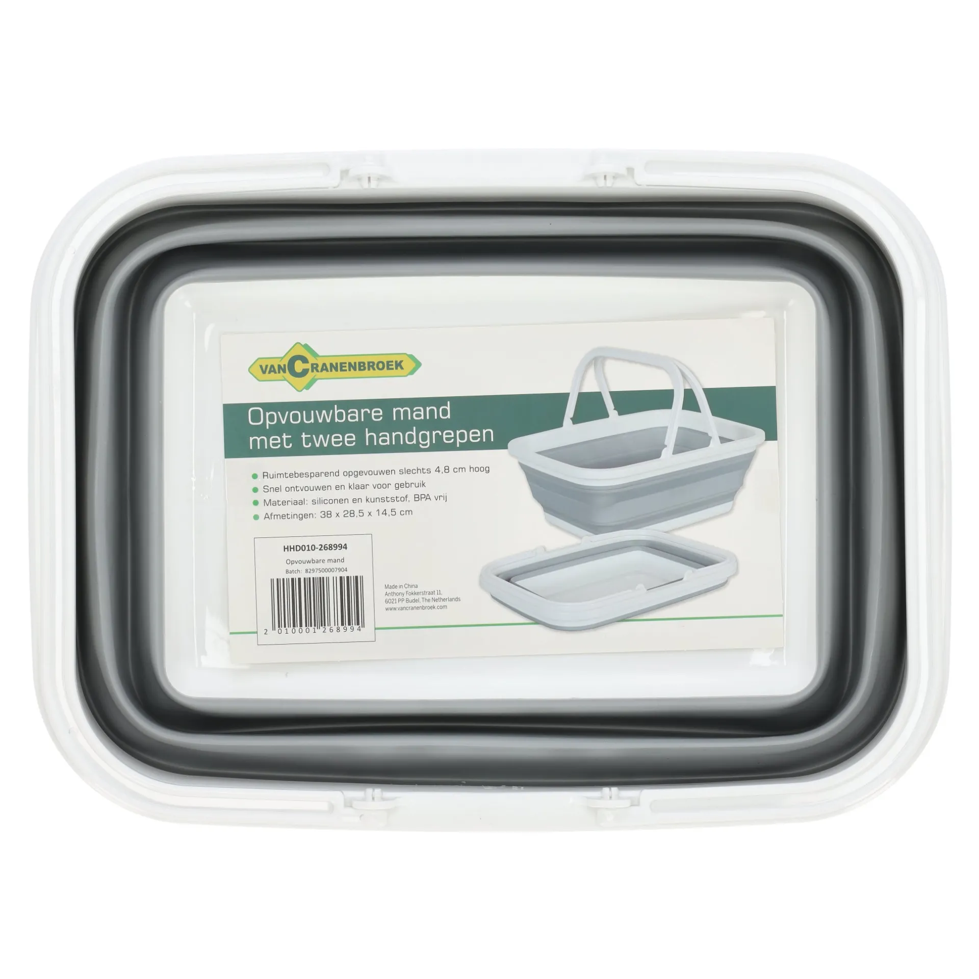 Deze opvouwbare mand is gemaakt van kunststof en heeft flexibele wanden. Dankzij het inklapbare ontwerp neemt de mand weinig ruimte in wanneer hij niet wordt gebruikt. De stevige handgrepen maken het dragen eenvoudig en de mand is geschikt voor het opbergen of vervoeren van verschillende spullen.