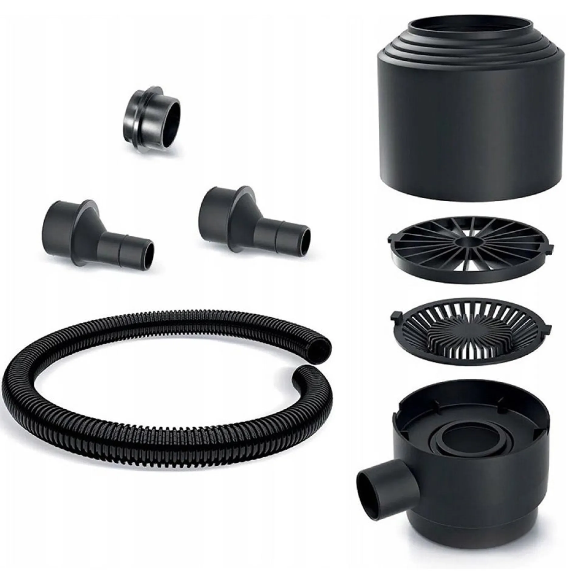 Dakgootfilterset met aansluitstukken en flexibele slang voor het koppelen van een regenton aan de regenpijp en het voorfiltreren van bladeren en vuil uit het regenwater.