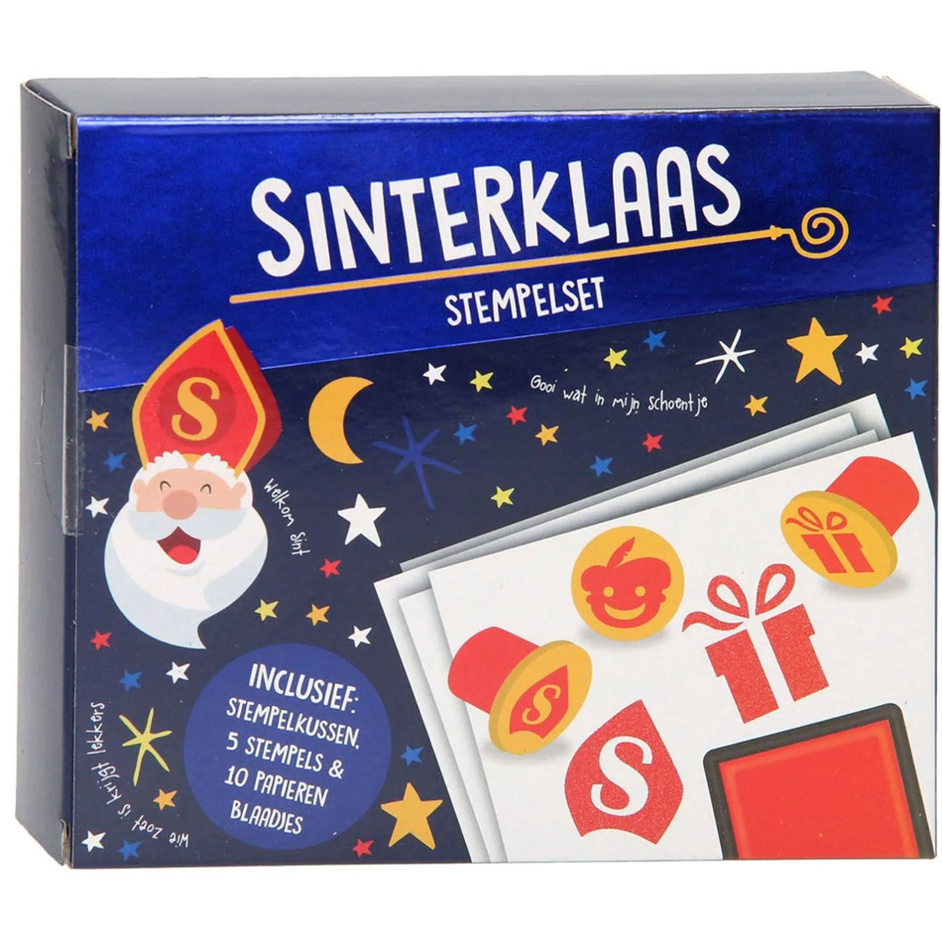 Sinterklaas-stempelset met 5 vrolijke stempels, een stempelkussen en 10 blaadjes papier. De stempels hebben leuke Sintfiguren zoals cadeautjes, maan, mijter en Pietengezichtjes. Ideaal voor knutselplezier in de Sinterklaastijd. Geschikt voor kinderen vanaf 3 jaar.